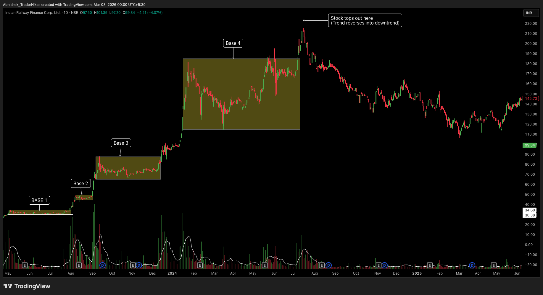 Look at the chart of IRFC below, it created 4 Bases i.e. 3 more bases after the one that we discussed above, and finally turned downtrending after creating a price top.